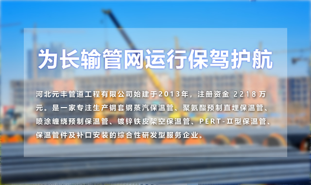 河北元豐管道工程有限公司始建于2013年,注冊(cè)資金2218萬(wàn)元。是一家專(zhuān)注生產(chǎn)鋼套鋼蒸汽保溫管、聚氨酯預(yù)制直埋保溫管、噴涂纏繞預(yù)制保溫管、鍍鋅鐵皮架空保溫管、PERT-Ⅱ型保溫管、保溫管件及補(bǔ)口安裝的綜合性研發(fā)型服務(wù)企業(yè)。
